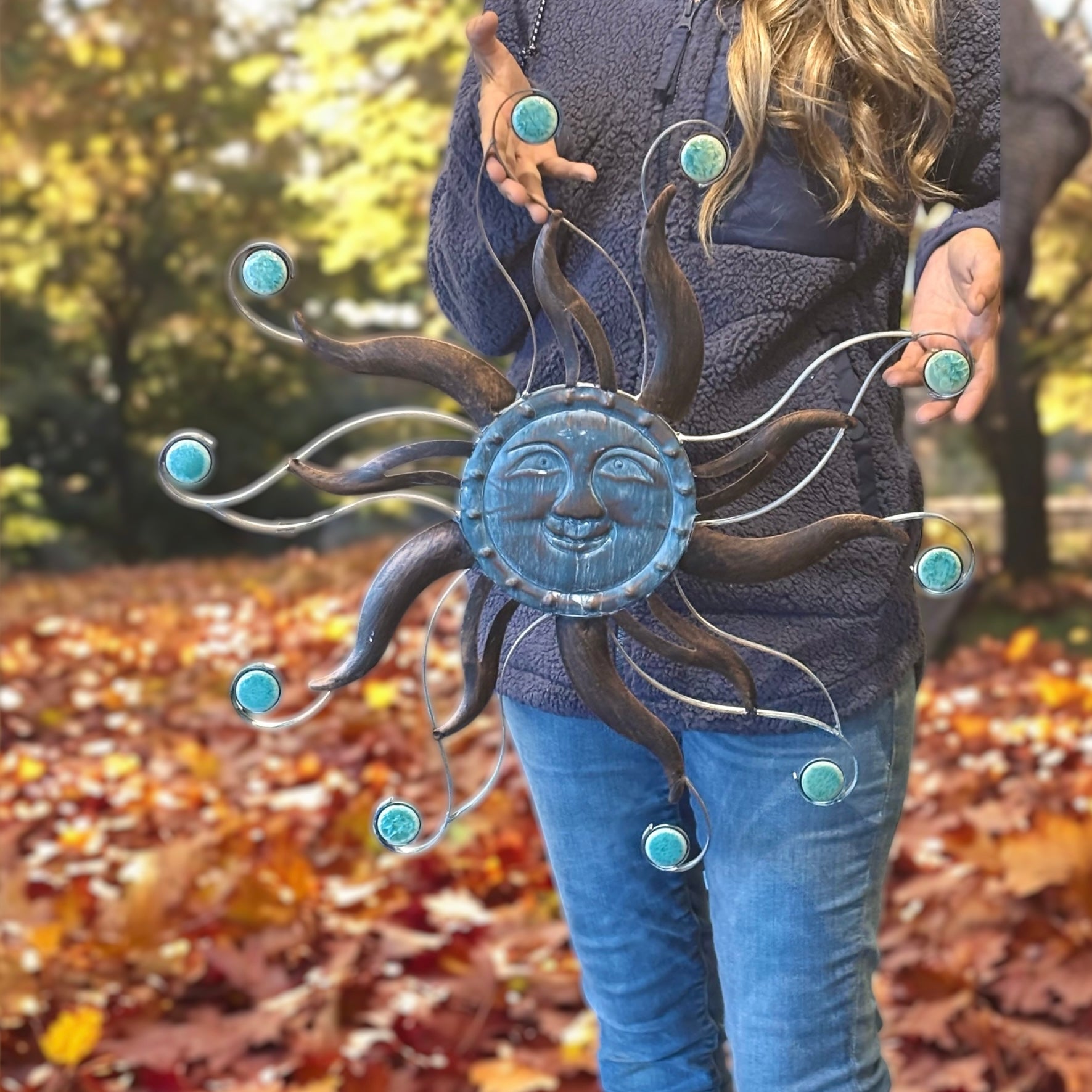 This beautiful aged copper finish metal smiling sun face wall hanging measures 22 inches in diameter. Featuring a wonderful personality, with open and closed work metal rays and mottled ceramic disc bead accents, this wall hanging looks great on any wall, indoors and outdoors, and makes a great housewarming gift.