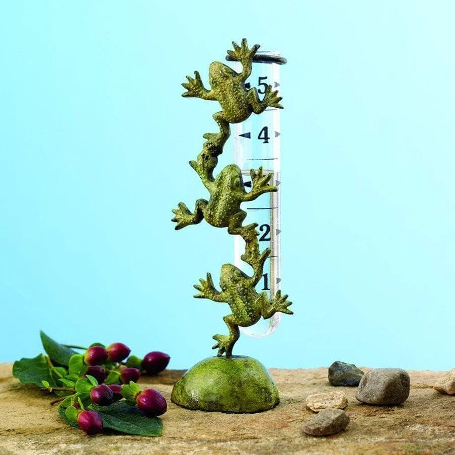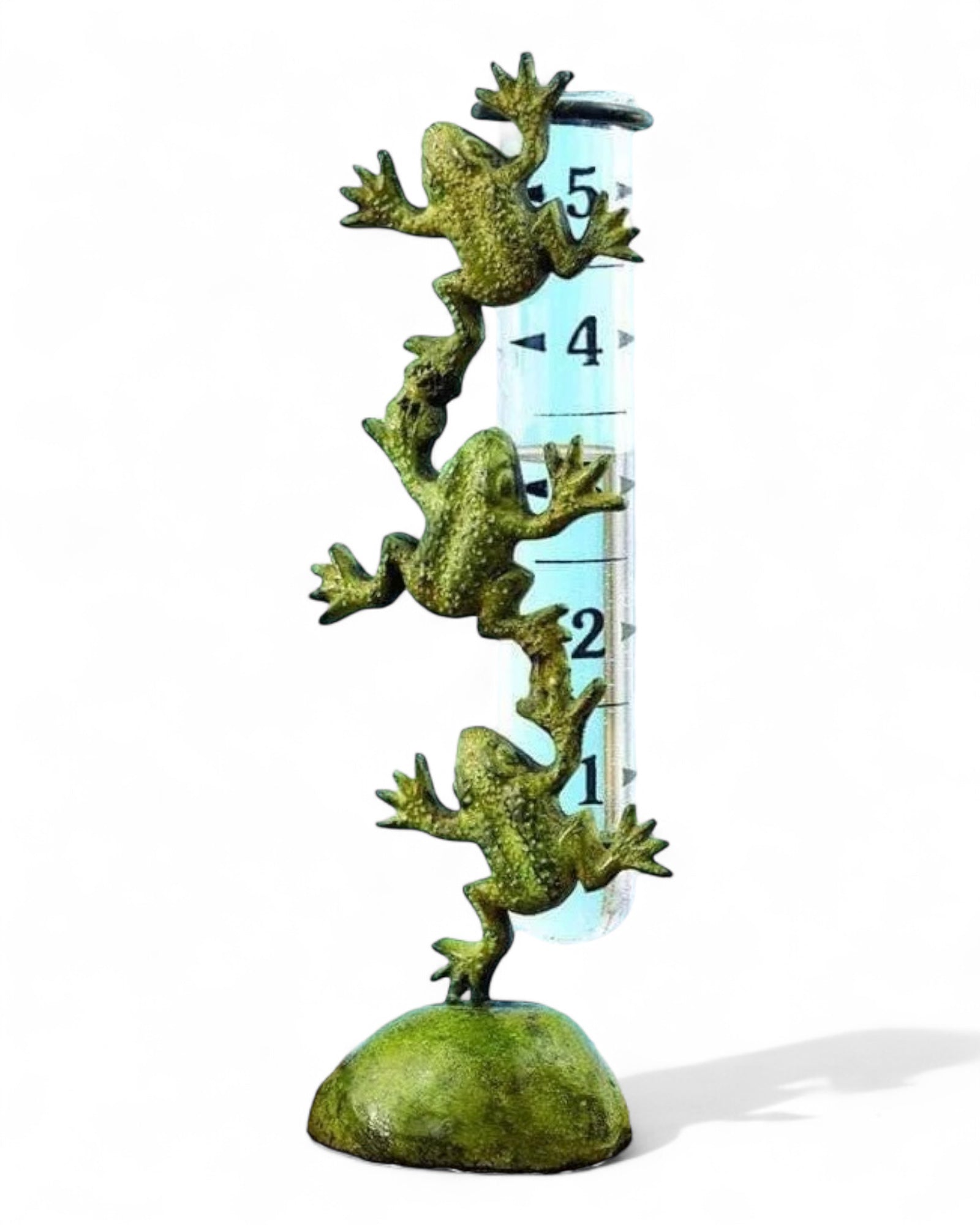 A trio of cheerful frogs help you keep track of rainfall! Our Cast Brass Frog Rain Gauge makes a fun addition to your outdoor space; simply place it where rain falls steadily, and you’ll be able to tell how much precipitation your garden received. A sturdy base prevents tipping. This item is handcrafted by talented artisans, and brings lasting beauty to your outdoor space.