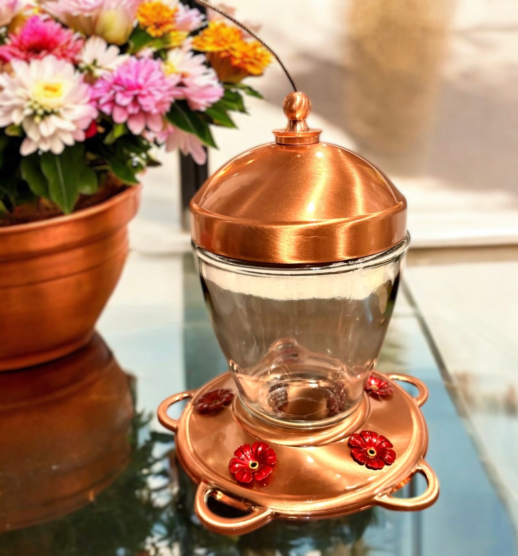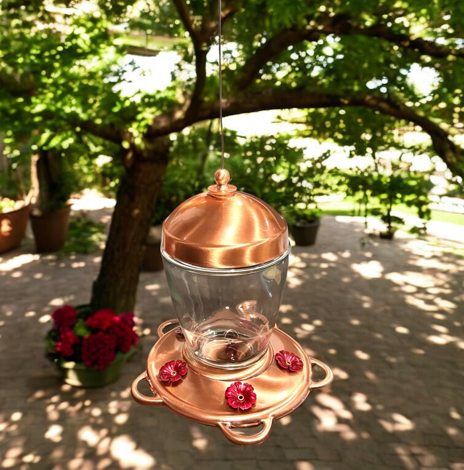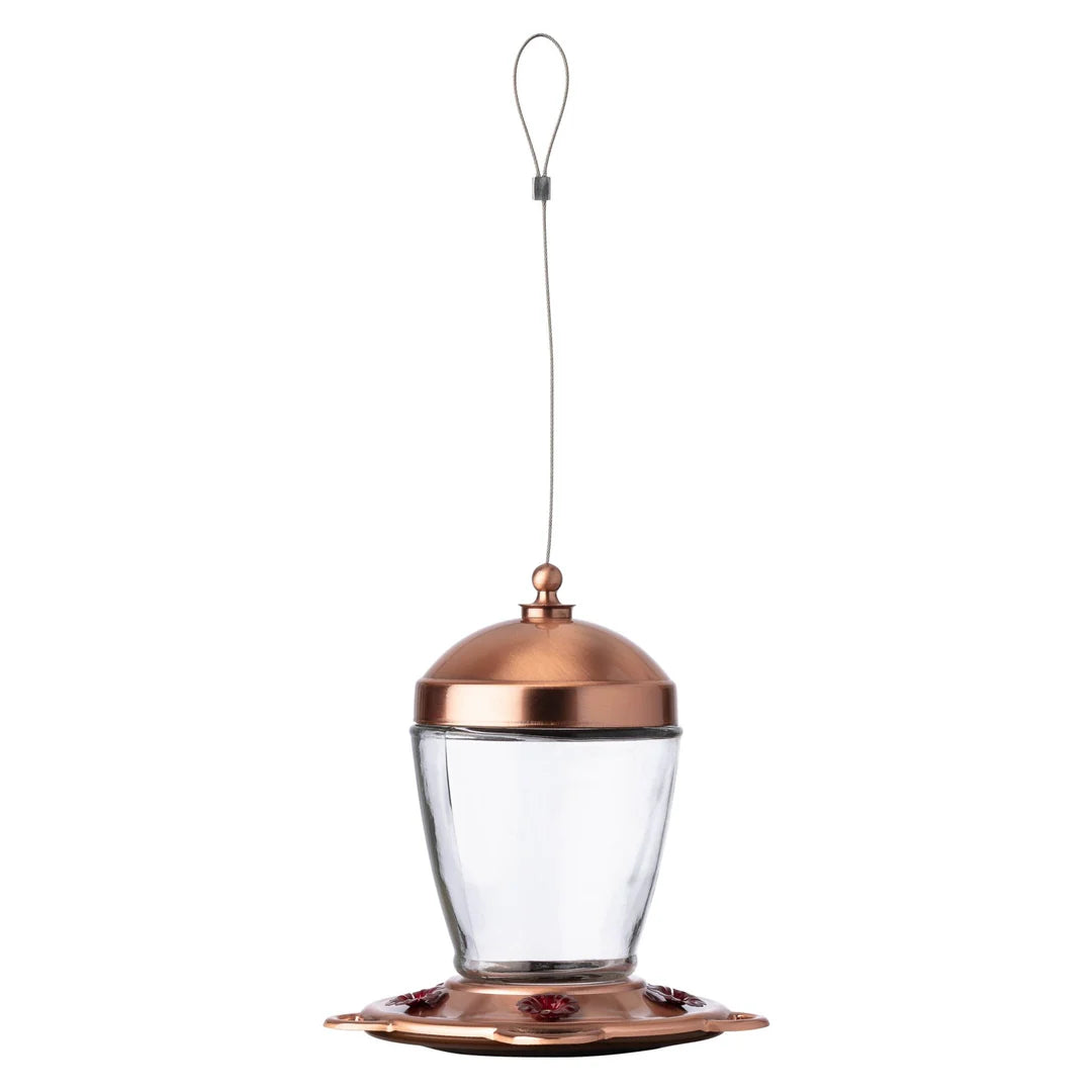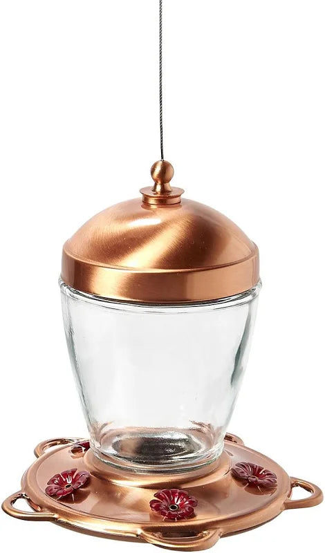 Its beautiful brushed copper and glass design adds a splash of elegance to your yard. The wide opening makes it easy to fill, and the feeder disassembles into three pieces for convenient cleaning. The Jubilee features 5 red metal flower ports, as well as 5 durable metal perches that provide hummingbirds a place to rest while feeding. The clear bottle keeps nectar levels within view so you know when it's time to refill, while its 32 oz. nectar capacity provides plenty of nectar to keep hummingbirds happy and coming back for more!