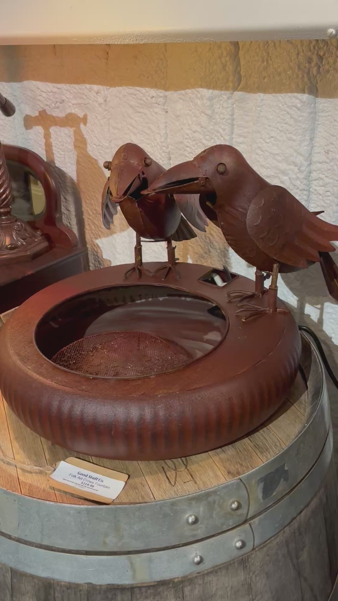 A charming addition to any patio or garden, this folk art inspired crow fountain features an aged, rust-color finish. The crows' beaks open and close with the flow of water. Submersible pump and splash screen included.