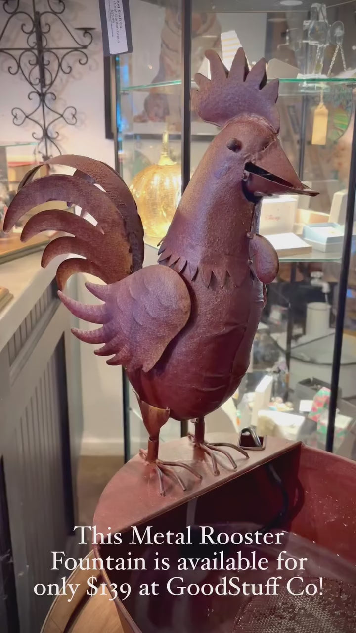 A charming addition to any patio or garden, our best selling whimsical Folk Art Rooster Fountain features an aged, rusted metal finish. The rooster's beak opens and closes with the flow of water. Submersible pump and splash screen included.