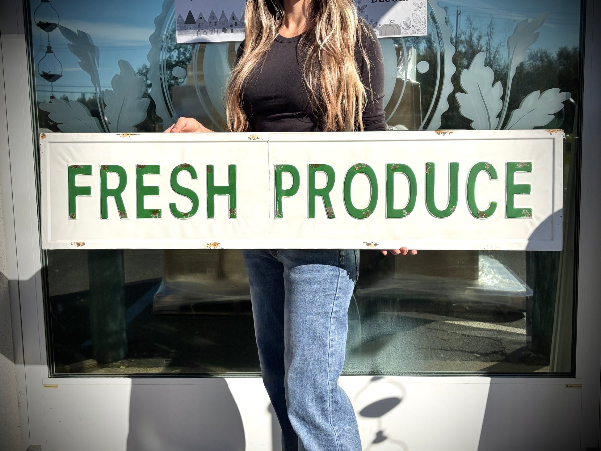Add vintage farmhouse charm to your kitchen or dining area with this Large Fresh Produce Metal Wall Sign. This extra-long vintage-inspired sign features embossed lettering in a distressed green finish that brings authentic rustic character to any space.
