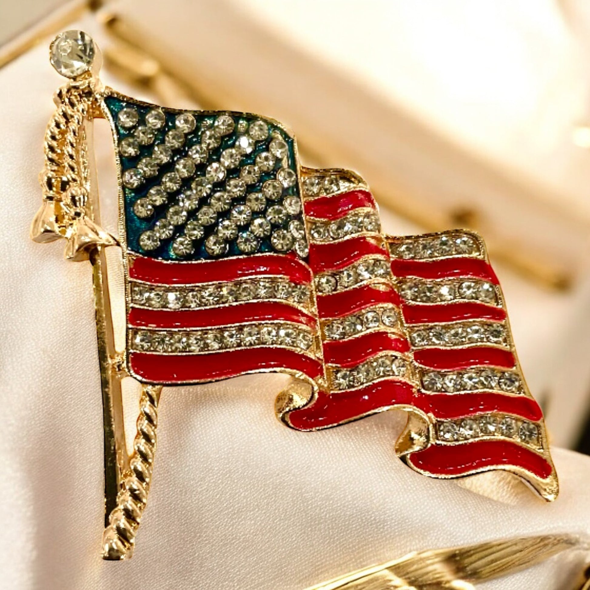 Let freedom ring whenever you wear this American flag pin! Sparkling with rhinestones, this piece is a perfect way to show off your pride. It would also make a perfect give for all patriots.