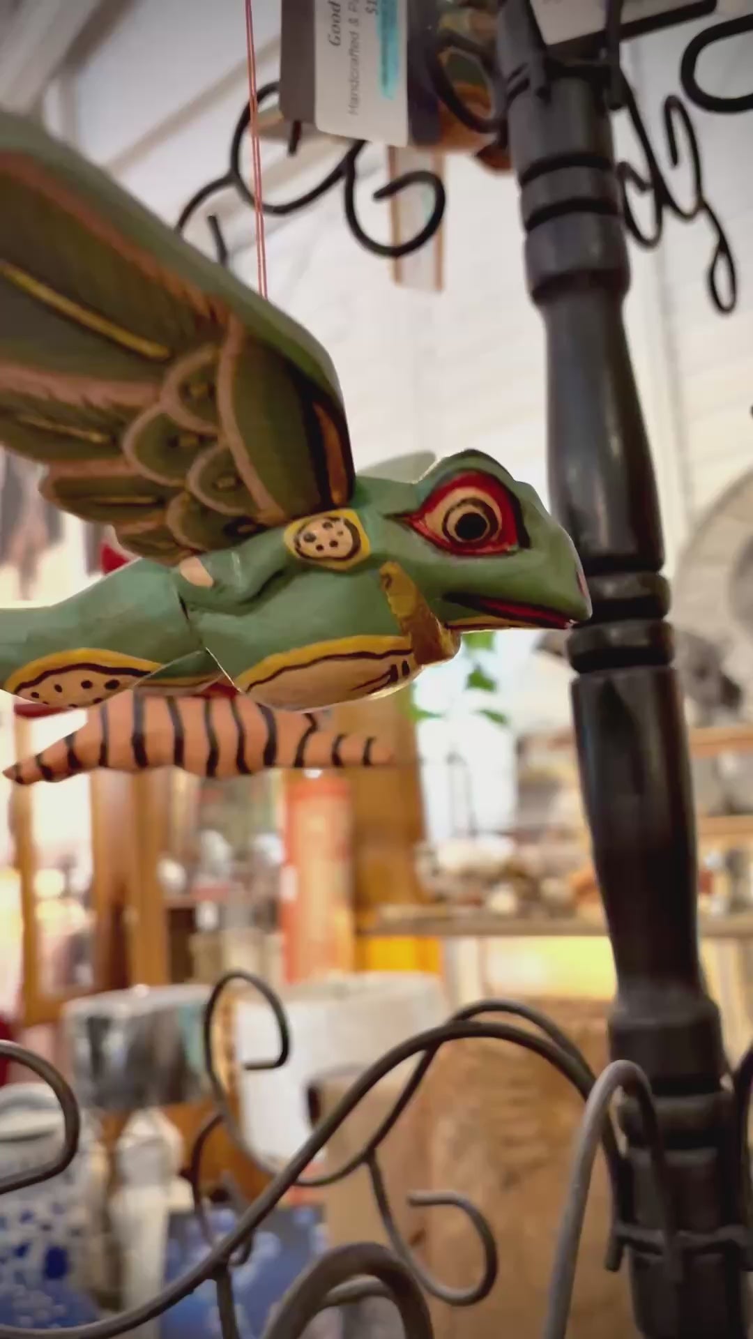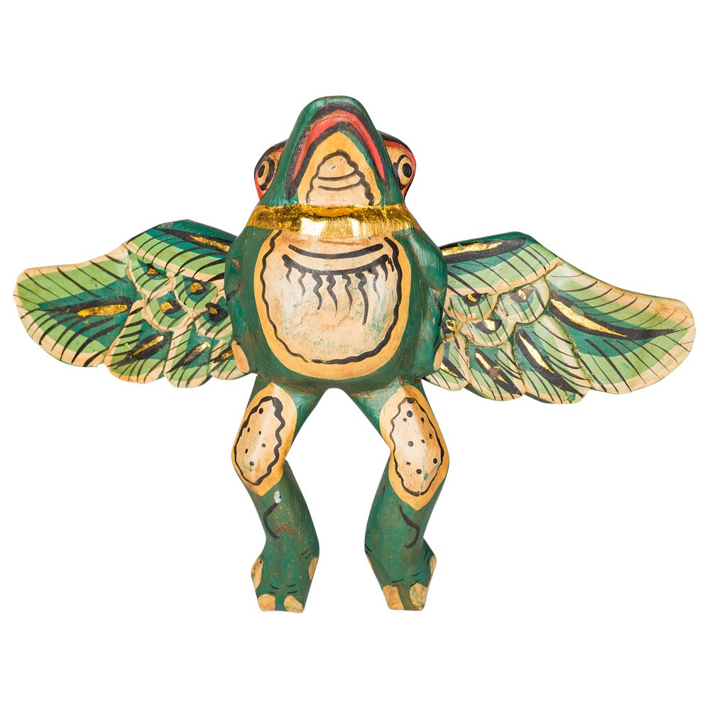 Our Flying Winged Frogs are handcrafted in Bali by talented Balinese crafts people. Albesia wood is carved and whimsically painted by hand in green with red highlights and gold leaf trim.