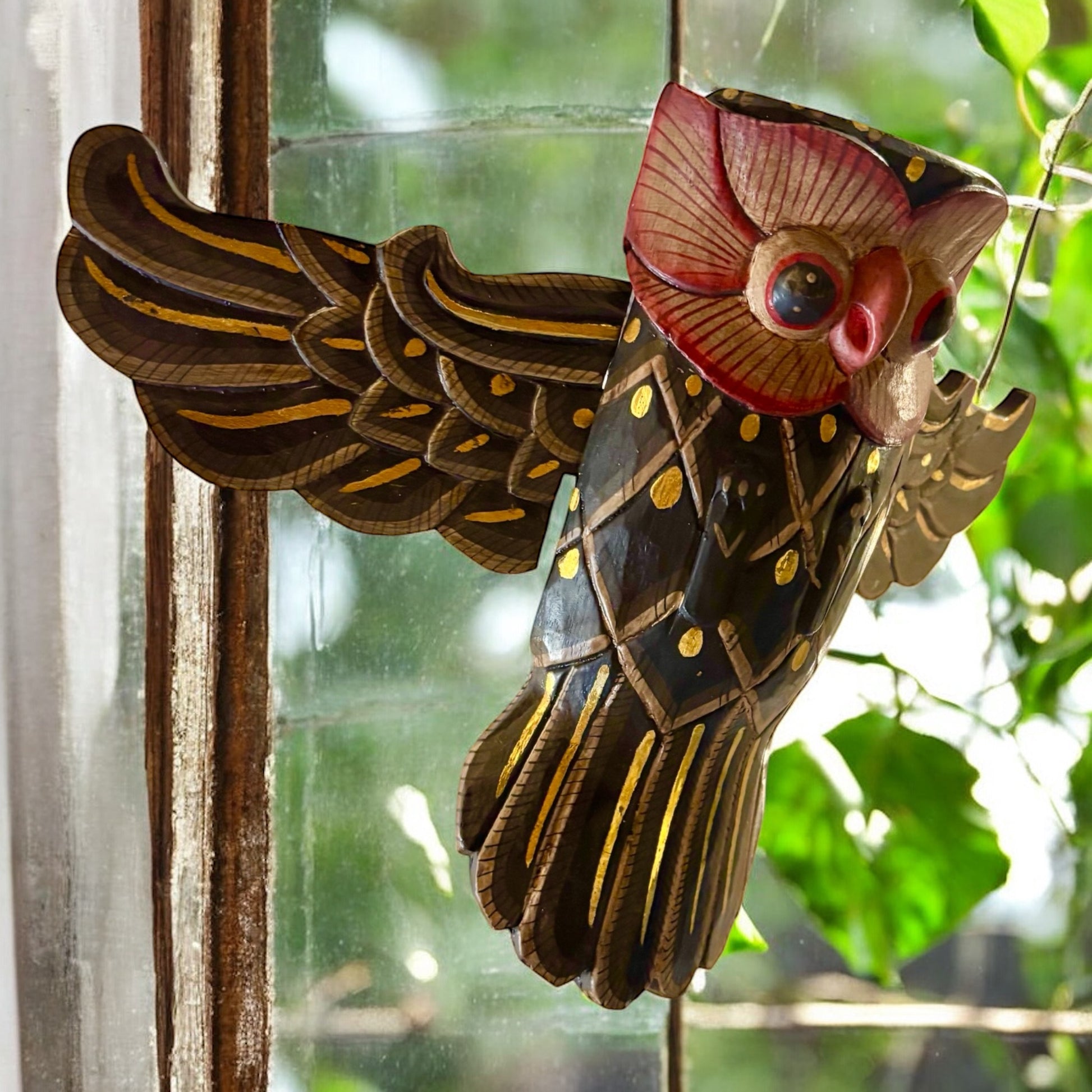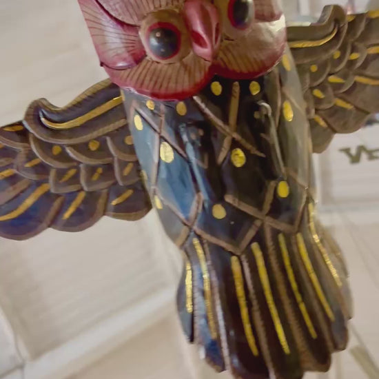 Our Wooden Flying Owls are handcrafted in Bali by talented Balinese crafts people. Albesia wood is carved and whimsically painted by hand.